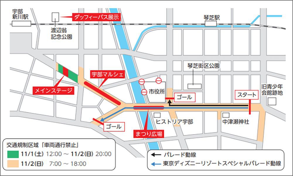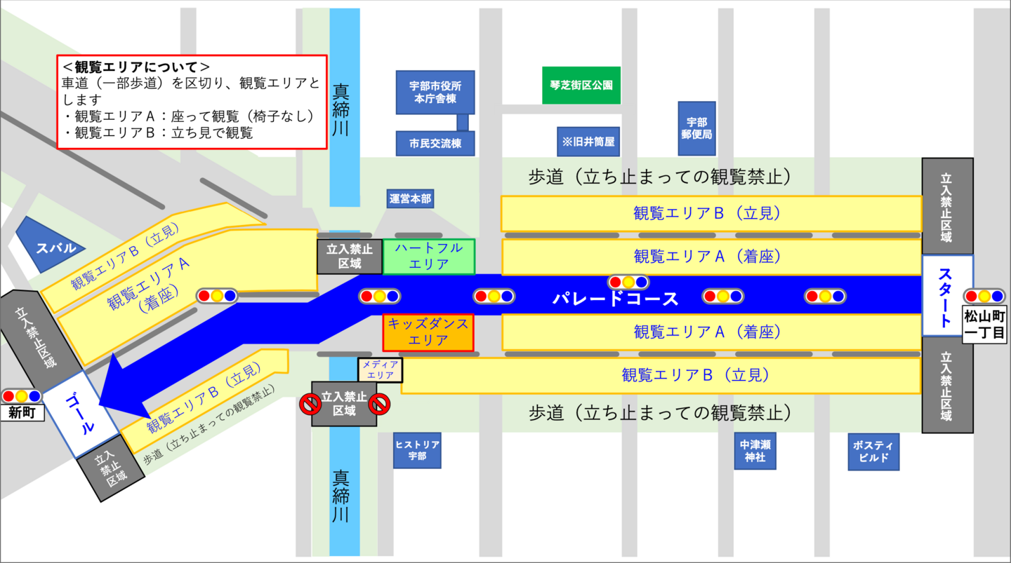 ・パレードコースのスタート地点・ゴール地点付近には、歩道も含めて通行できないエリアがありますのでご注意ください。該当エリアでは、歩行者の通り抜けもできませんので、別の道を迂回してください。
