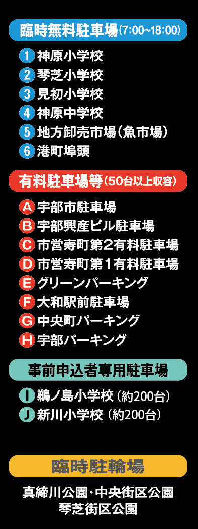 お車でお越しの場合、公式駐車場は従来の宇部まつりよりも多目に準備していますが、状況によっては渋滞の影響でご覧になりたいコンテンツに間に合わない可能性もありますので、なるべく時間に余裕をもってお越しください。