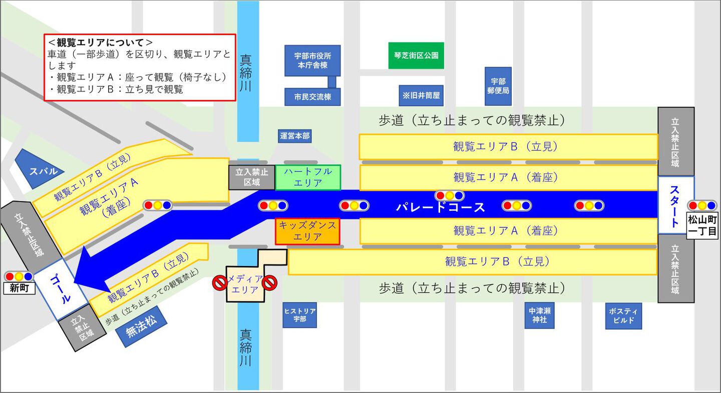 ・ベビーカー専用エリアの向かい側(ヒストリア宇部~新川橋付近)にメディア用エリアがあり、パレードの撮影を行う予定です。ベビーカー専用エリアに入場される方は、市またはメディアが写真・動画等を撮影し、各種メディア及び広告宣伝、パブリシティ等で使用することについて、すべての同伴者も含めて同意可能な方に限らせていただきますのでご了承ください。ベビーカー専用エリアへの入場をもって、撮影・使用等に承諾したものとします。